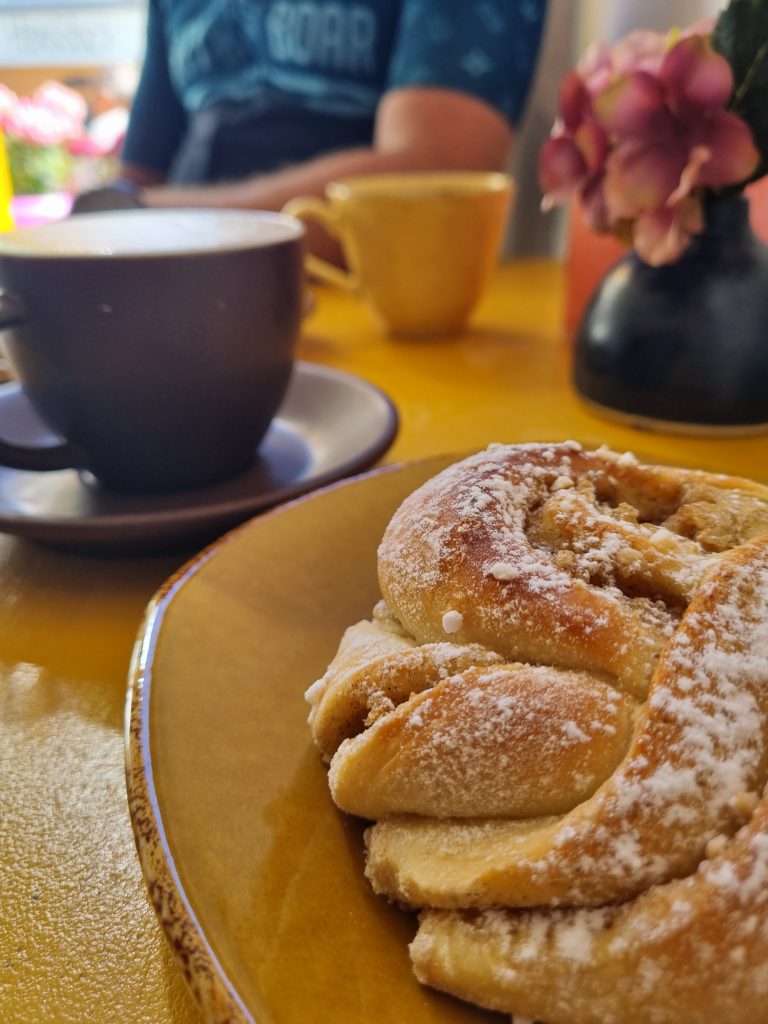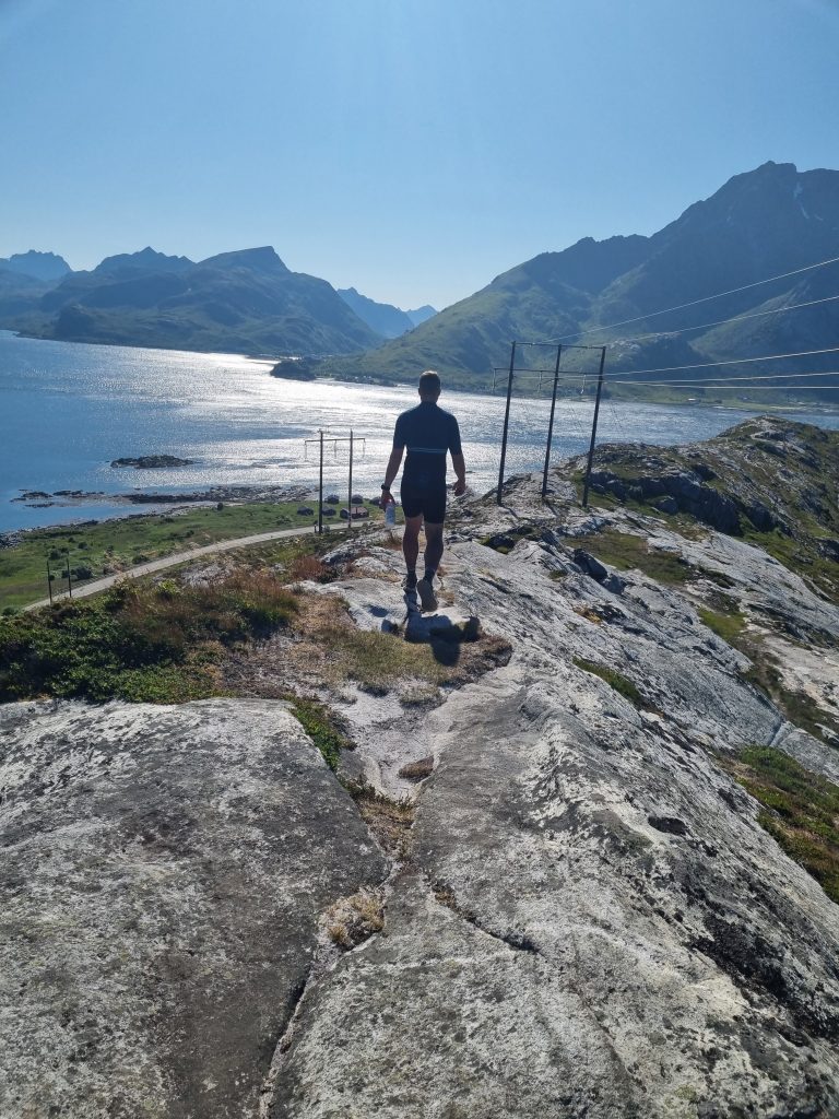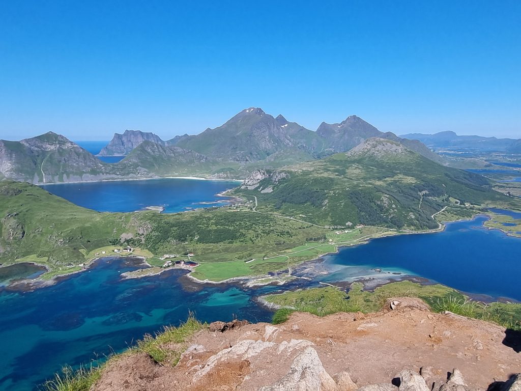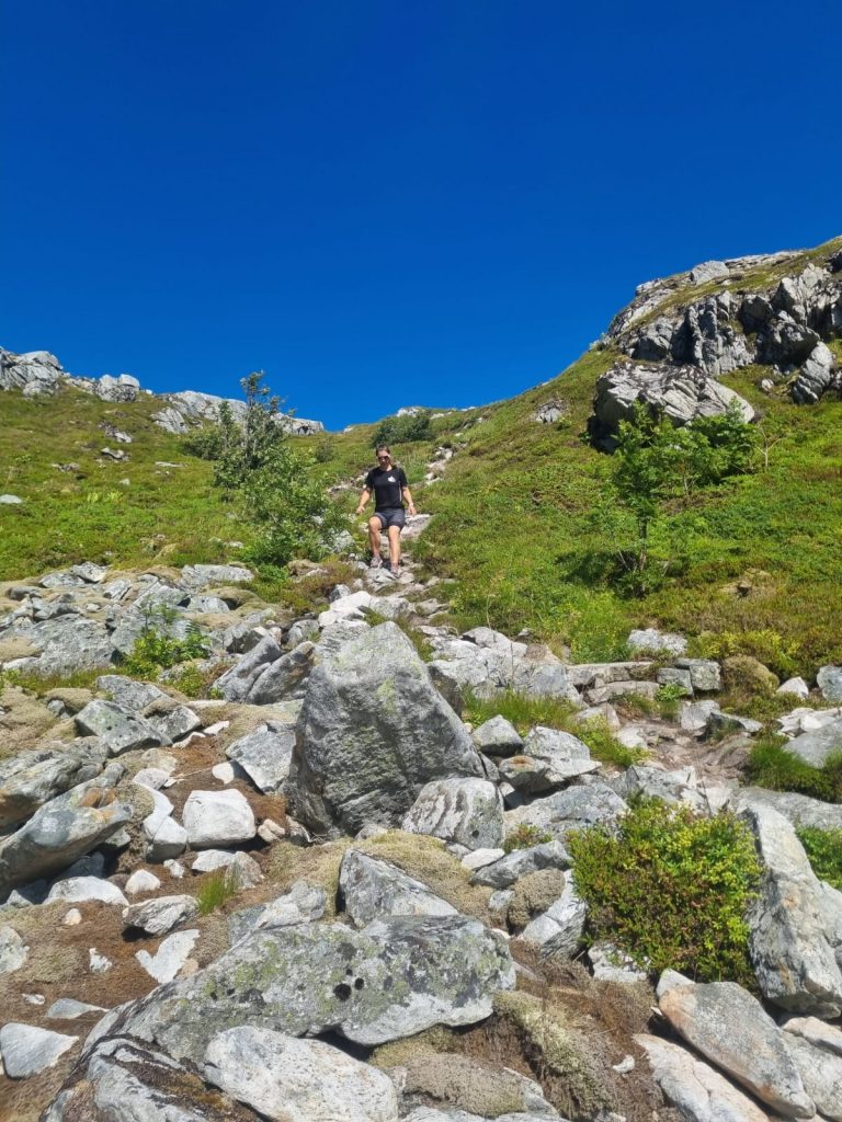 Wir genießen die Sonne auf unserer Haut und die wunderschönen Weitblicke über den Fjord. Nass geschwitzt erreichen wir den Gipfel. Ein wunderschöner 360 Grad Blick raubt uns fast den Atem. Staub klebt auf unserer Haut und wir teilen uns brüderlich die mitgenommene Kanelsnur.