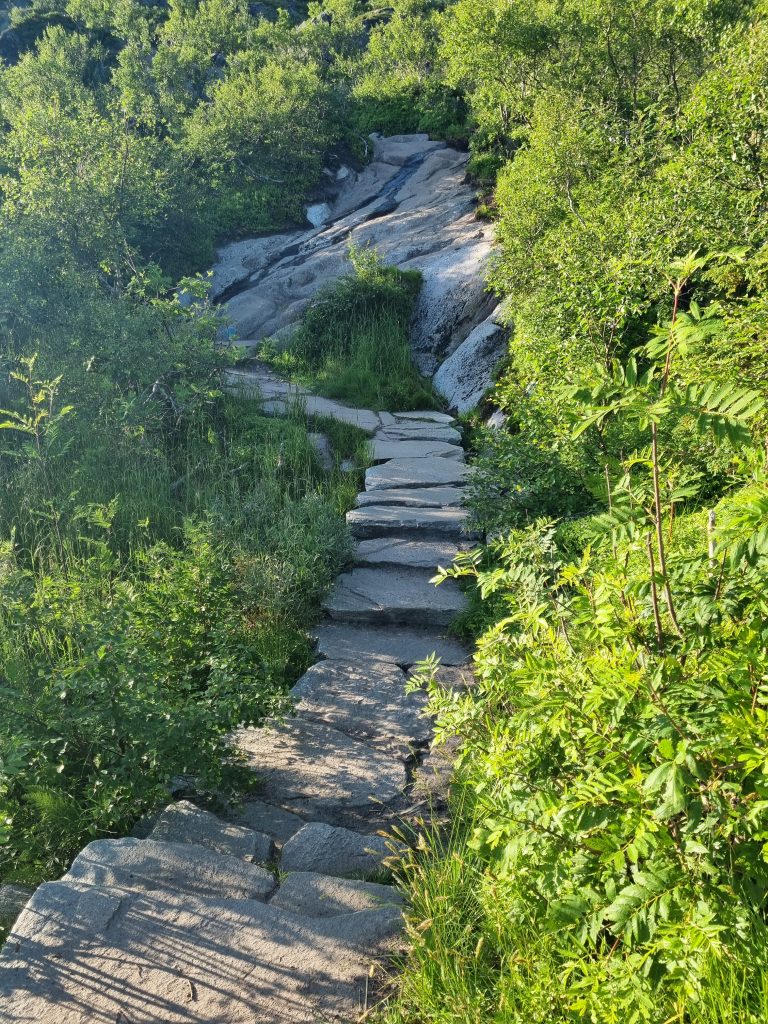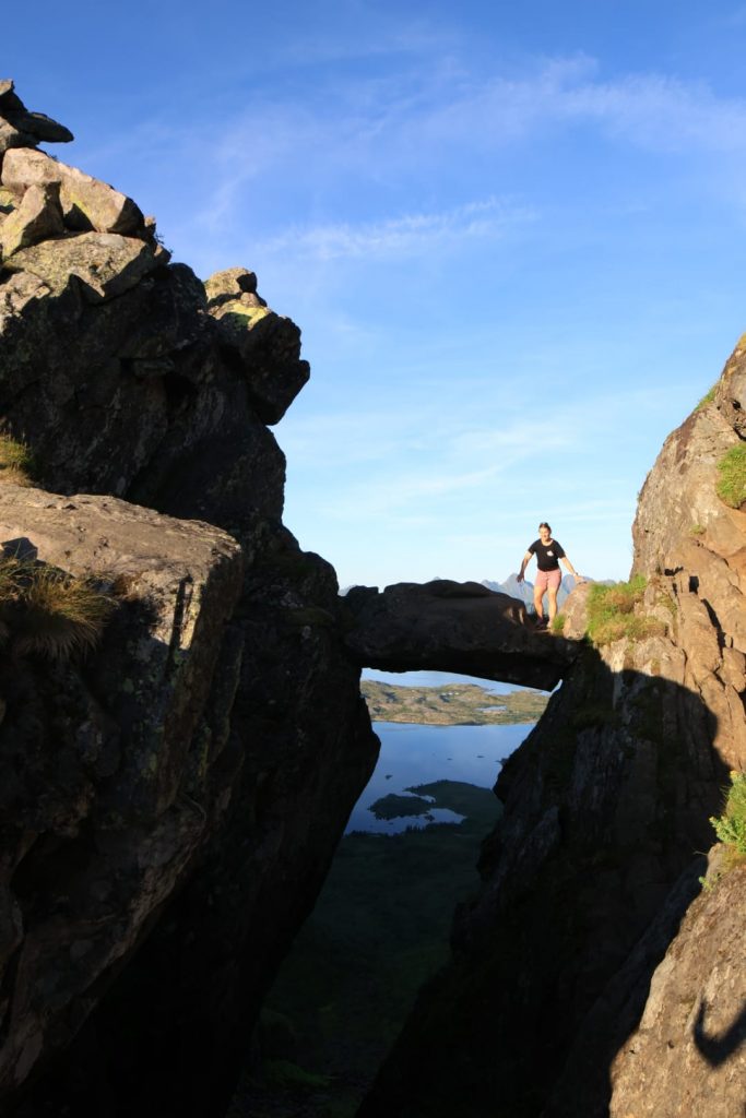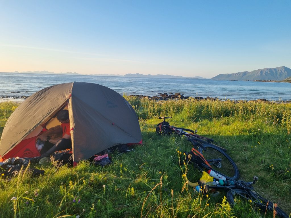 Erneut satteln wir die Rädern und treiben mit dem Strom bis nach Svolvaer. Das Rauschen der Autos mischt sich mit dem Ausblick auf kristallklares Wasser und dem aufkommenden Wind. Auf einem Wanderparkplatz schlagen wir unser Zelt auf und machen uns ohne Gepäck in den Abendstunden auf den Weg zur Teufelspforte.
