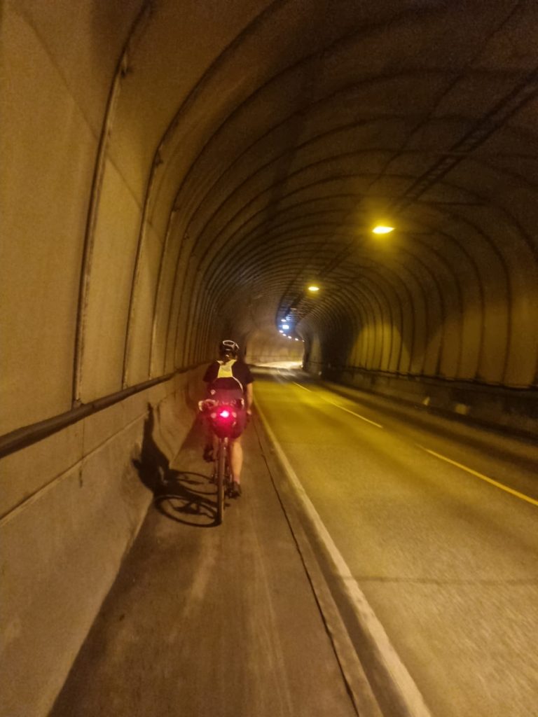 Mit Rücklicht, Warnweste und aufgebundener Stirnlampe, rolle ich vorsichtig hinein. Die Autos rauschen wie ein Donnergrollen an mir vorbei. Ihr Licht blendet mich, der Luftzug greift nach mir wie unsichtbare Tentakel. Ich versuche auf dem kaum einen Meter breiten Fußweg den Berg hinunter zu zirkeln, werde von Schlaglöchern aus der Bahn gerissen. Mit Gänsehaut am Körper bleibe ich am tiefsten Punkt stehen – Atme ängstlich die nassschwere Luft ein. Ab jetzt geht es nur noch bergauf, ermutige ich mich. In Schlangenlinien folge ich dem Weg, Scherben und Plastikteile liegen wie drapierte Fallen mit lechzenden Zähnen in meiner Spur. Ich erkenne Licht am Ende des Tunnels und mich empfängt die Wärme des Tages im Leben zurück.