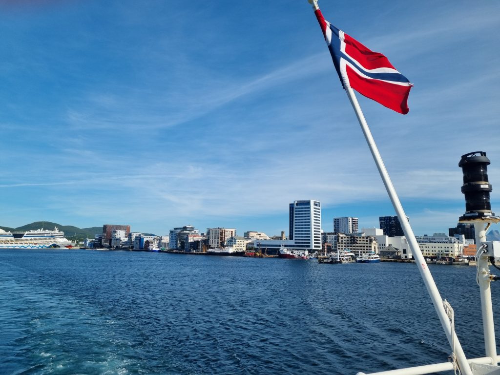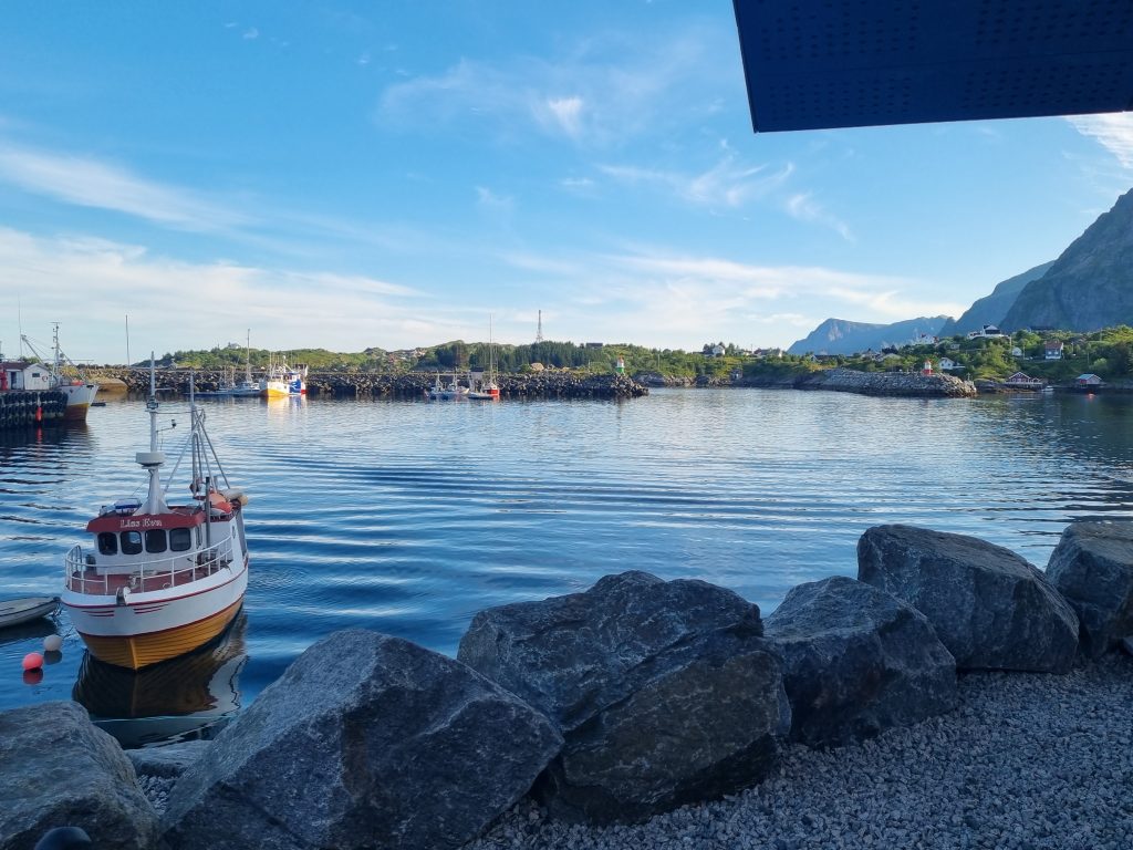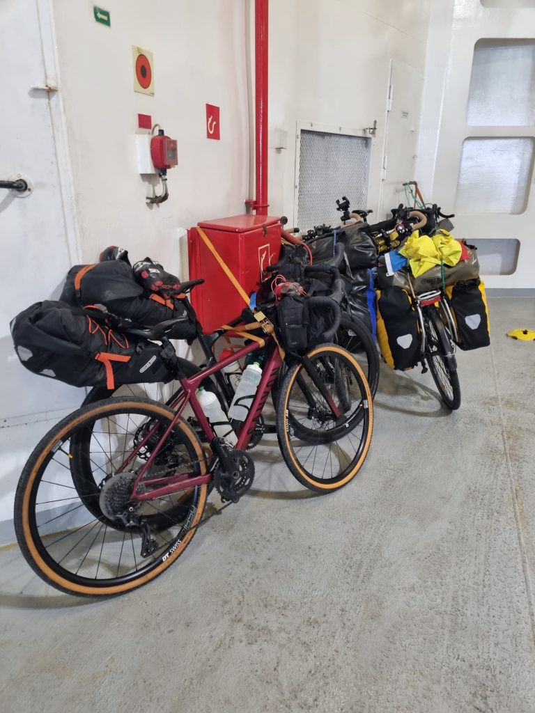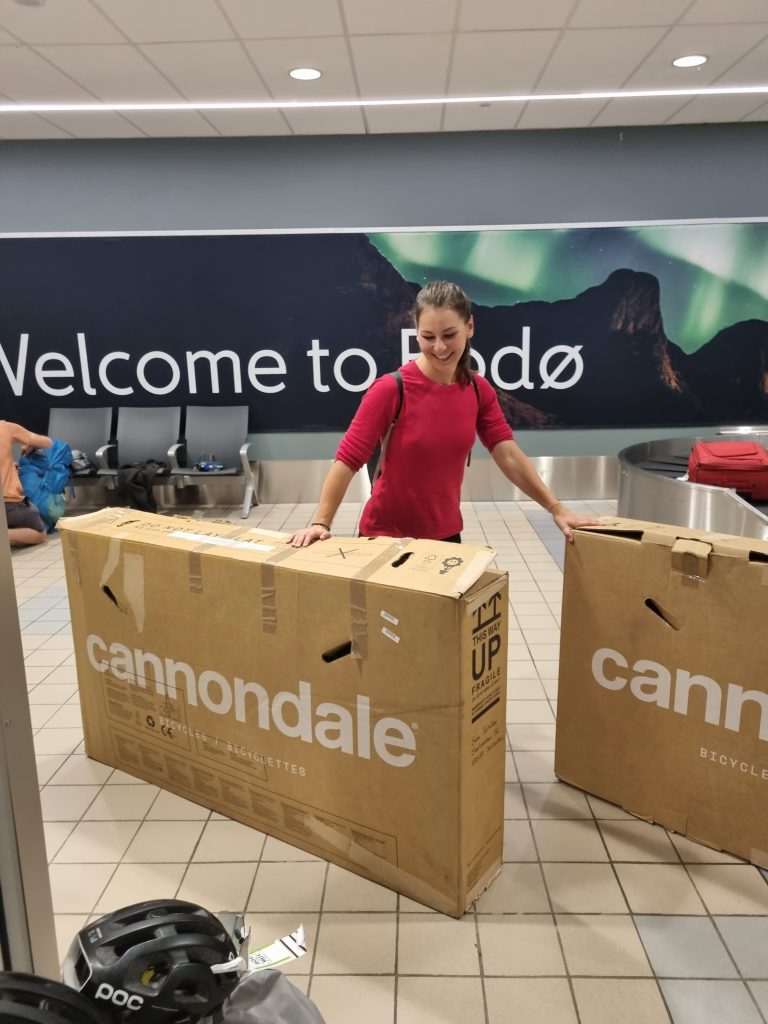 Nachdem wir mit zwei Radkartons und zwei Seesäcken voller Radtaschen gelandet sind, werfen wir alle Kleidungsstücke von uns und machen uns auf den Weg zum Fähranleger. Es kann loslegen! Nach einer gut gelaunten Ehrenrunde auf zwei Rädern durch Bodo und vielen Herz-Lufthüpfern, finden wir uns schon bald auf der vierstündigen Fährfahrt nach Moskenes wieder. Wir haben uns entschieden, die Inselgruppe von Süden in den Norden zu durchqueren und schließlich von Tromsö aus wieder nach Hause zu fliegen. Sozusagen von  nach T.