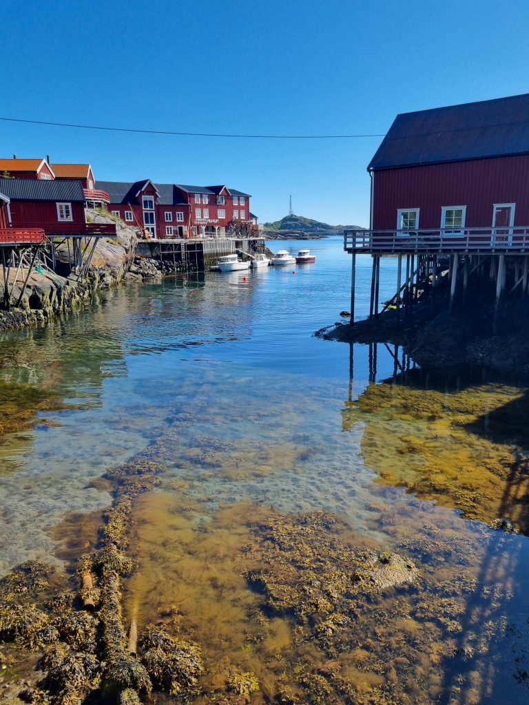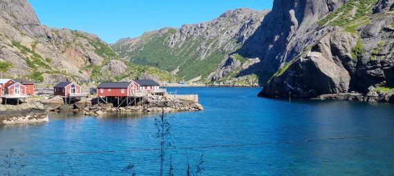 Wieder auf dem Boden der Tatsachen angekommen, möchten wir uns das kleine Fischerdörfchen Reine ansehen und uns bei über 30°C mit einem Eis belohnen. Doch nachdem wir Slalom zwischen Wohnmobilen hindurch in das Örtchen hinein gefahren sind und direkt zwei Reisebusse Touristengruppen ausspucken, legen wir nur einen kurzen Boxenstopp ein und radeln weiter…