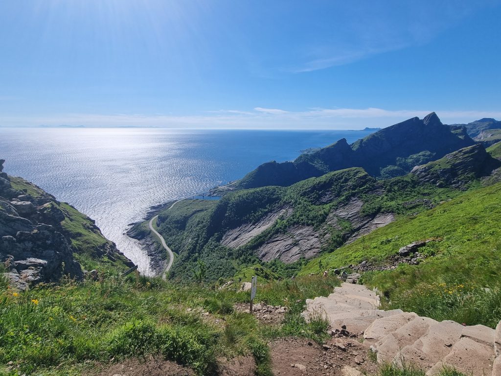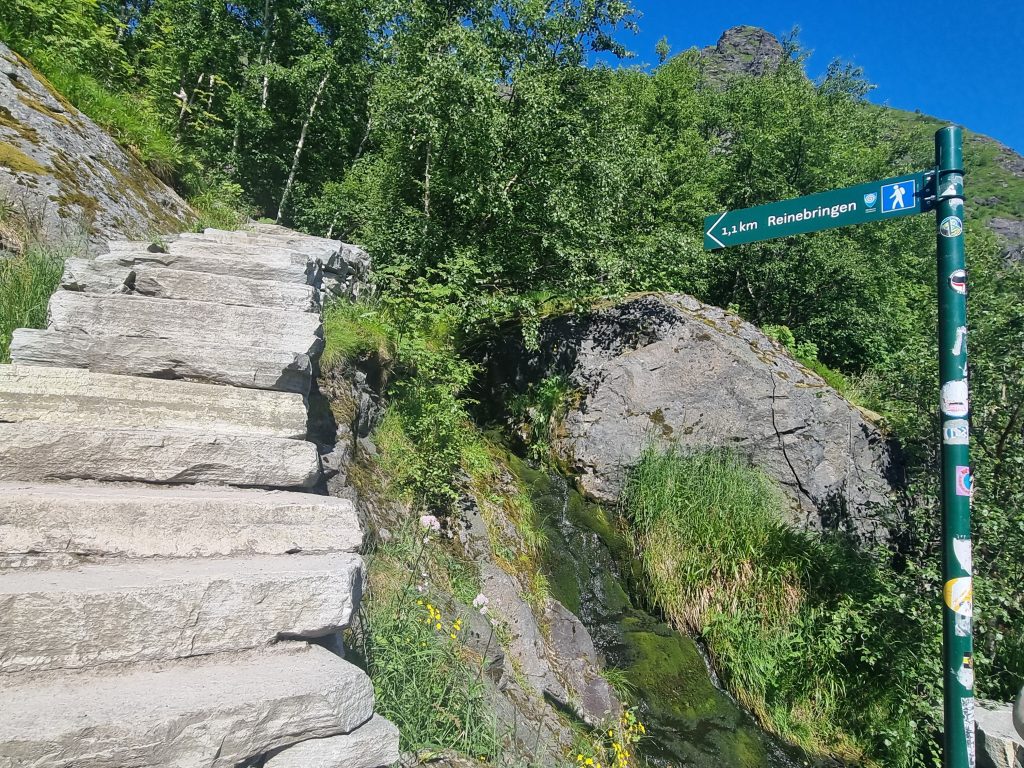 So binden wir unsere Räder an und machen uns an den Anstieg zu unserem ersten Gipfel – dem Reinebringen. 1500 – 2000 Stufen trennen uns vom Ziel und mit jedem Schritt rücken wir näher an den Gipfel heran. Der Schweiß läuft in Strömen an meinem Kinn herab, während ich auf den ungleichen Stufen Schritt für Schritt in den Himmel steige. Unter mir tut sich ein unglaubliches Panorama auf und ich bleibe immer wieder stehen und genieße den weiten Blick.